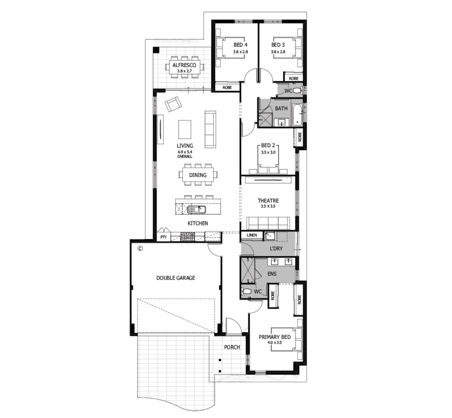 The primary bedroom is your own private retreat with an ensuite and walk-in robe, while three additional bedrooms are cleverly positioned at the rear of the home. Moody, modern and thoughtfully designed, The Oscar is a home that just works.
